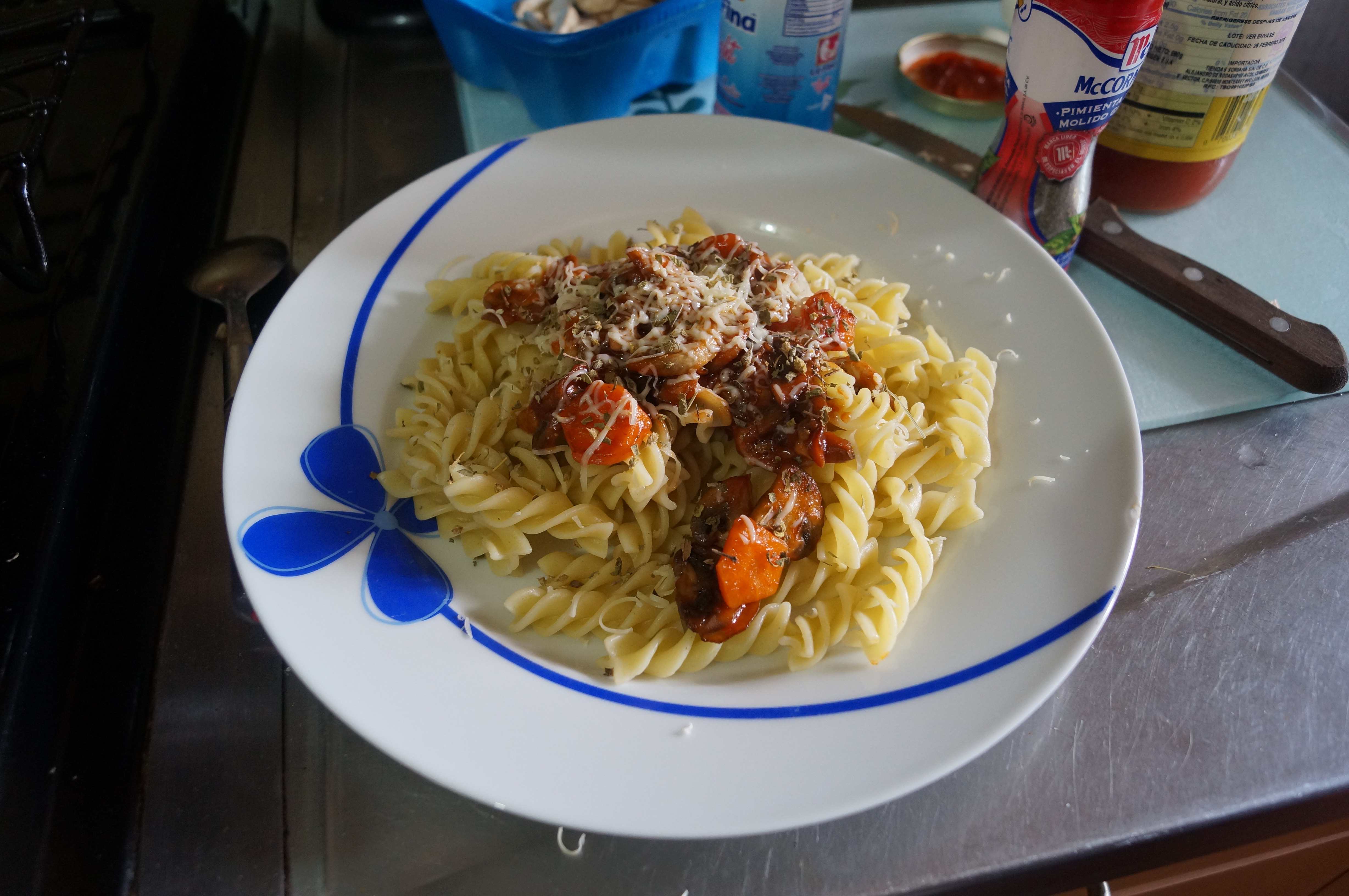 Para finalizar, ponemos la pasta en un plato, agregamos la mitad de lo que hicimos en la sartén. Y digo la mitad porque la receta es para dos, y si no queréis que el otro os mande bien lejos mejor que le guardéis. Rallamos un poco de queso encima de la pasta y agregamos orégano. Et voilà!