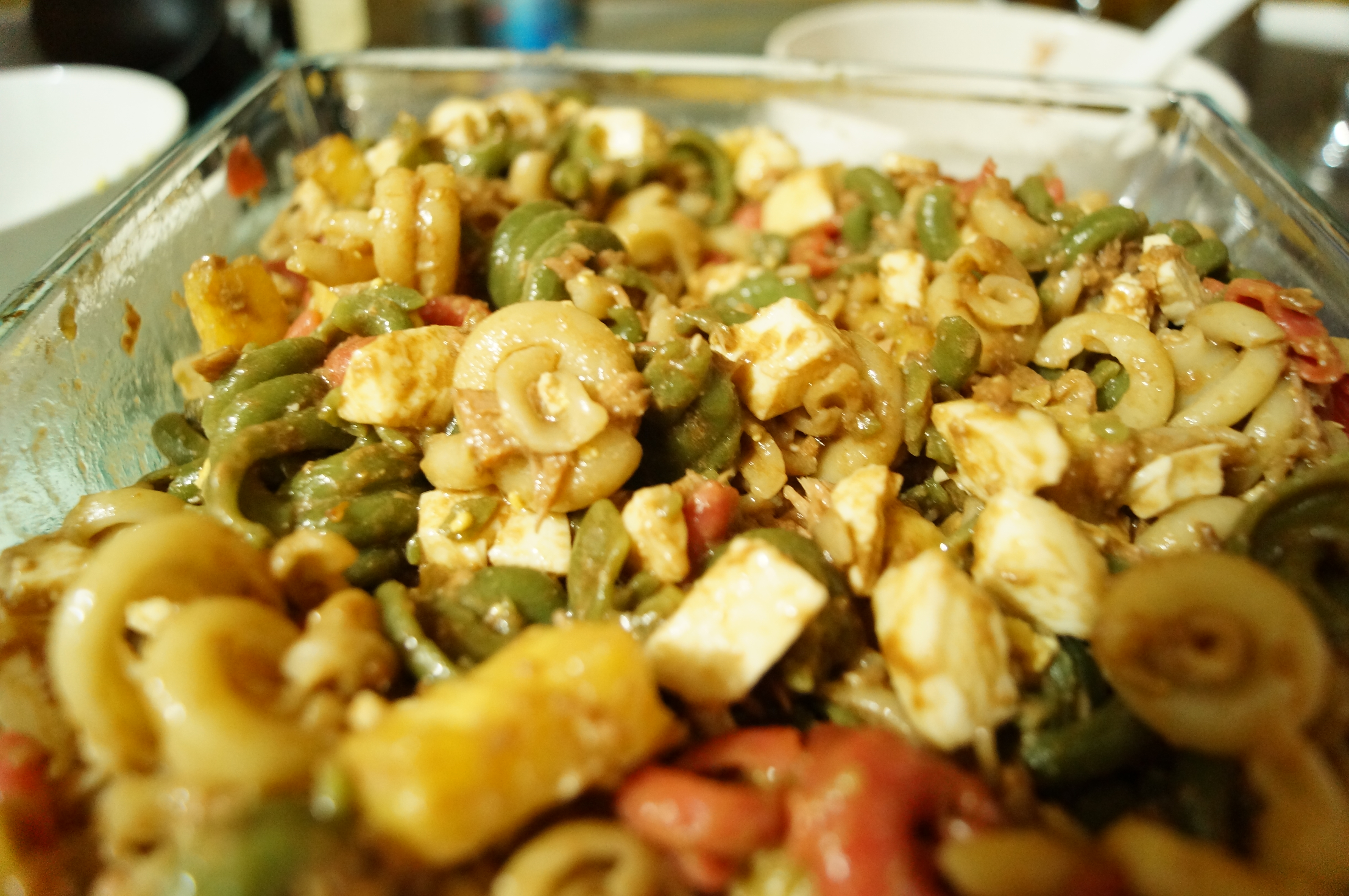 Mientras que todo cuece, prepararemos el resto de los ingredientes. Cogemos un bol bien grande, donde vayamos a servir la pasta y echamos el queso feta, la piña y los huevos, una vez hechos, bien picado. Agregamos la pasta ya escurrida y removemos.