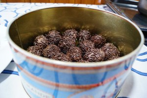 Pasado este tiempo, sacamos del refri y dejamos reposar un ratito para que no esté tan fría la masa. Ahora viene lo divertido. Os aconsejo, una silla cómoda y que os pongáis un capítulo de lo último que estéis viendo, en mi caso House of Cards. Agarramos una cuchara de café, o una cuchara sopera (pero no la llenéis entera) y cogemos un poco del chocolate de la cacerola. Estará duro y es normal, porque sino a la hora de hacer las trufas se nos quedarían las manos pringosas y las trufas blandongas. Hacemos una bola con las manos y la bañamos en los fideos que previamente habremos vertido en un plato hondo. Y así hasta terminar el chocolate.