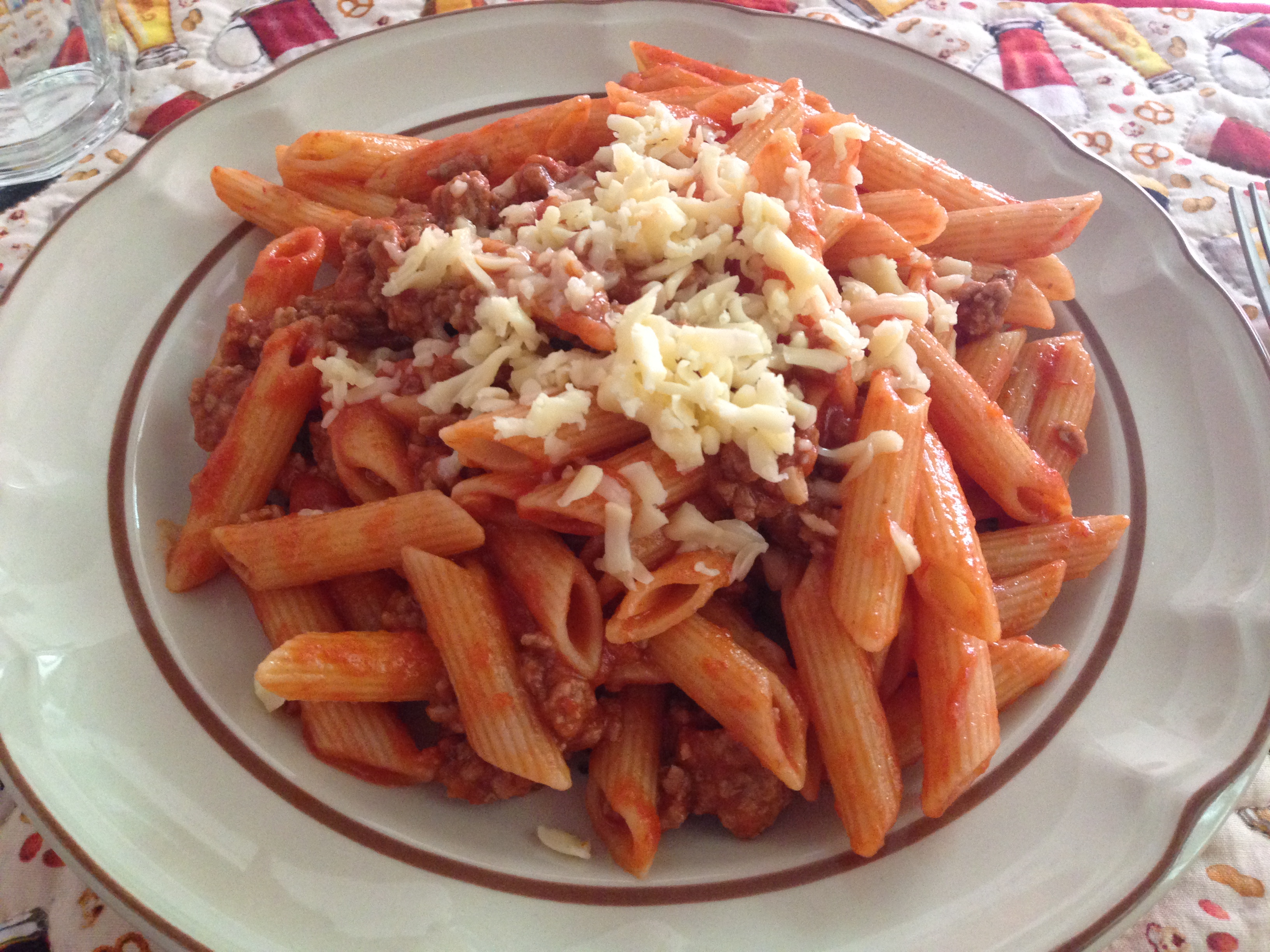 Cuando la pasta esté cocida al gusto de cada uno, escurrimos e inmediatamente agregamos a la sartén con la carne. Echamos tomate frito al gusto y removemos para que se mezcle todo bien.