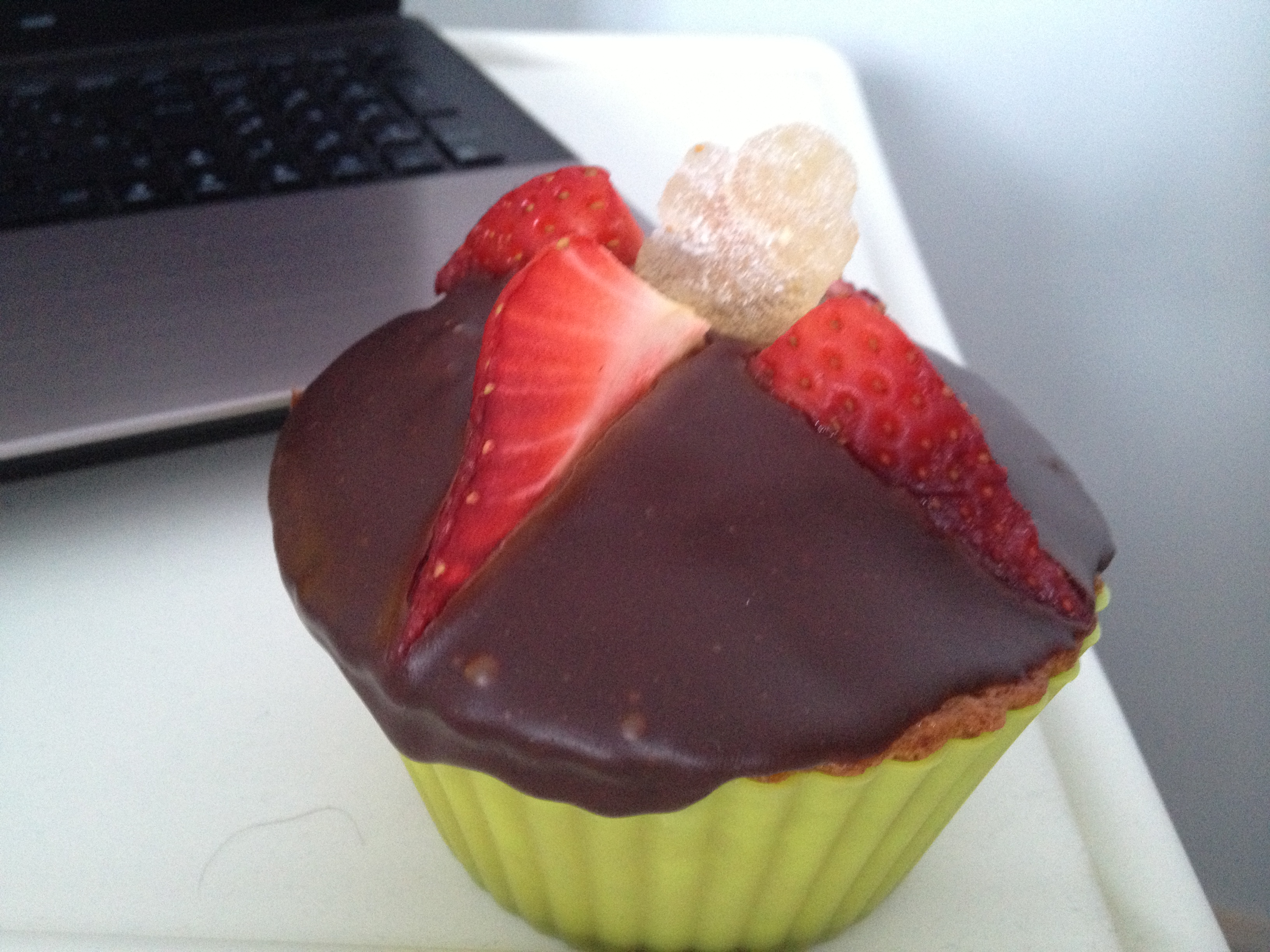Las dejamos enfriar y mientras pasamos a hacer la cobertura. Calentamos al baño maría nuestro chocolate hecho trozos hasta que se derrita. Retiramos del fuego y con ayuda de una cuchara vamos echando un poco por cada muffin hasta que queden cubiertas. Decoramos con fresas cortas, plátano o la fruta que más nos apetezca. ¡OJO! Si las decoráis con gominolas, esperad a que el chocolate se enfríe un poco o se derretirán. ¡Y listas!