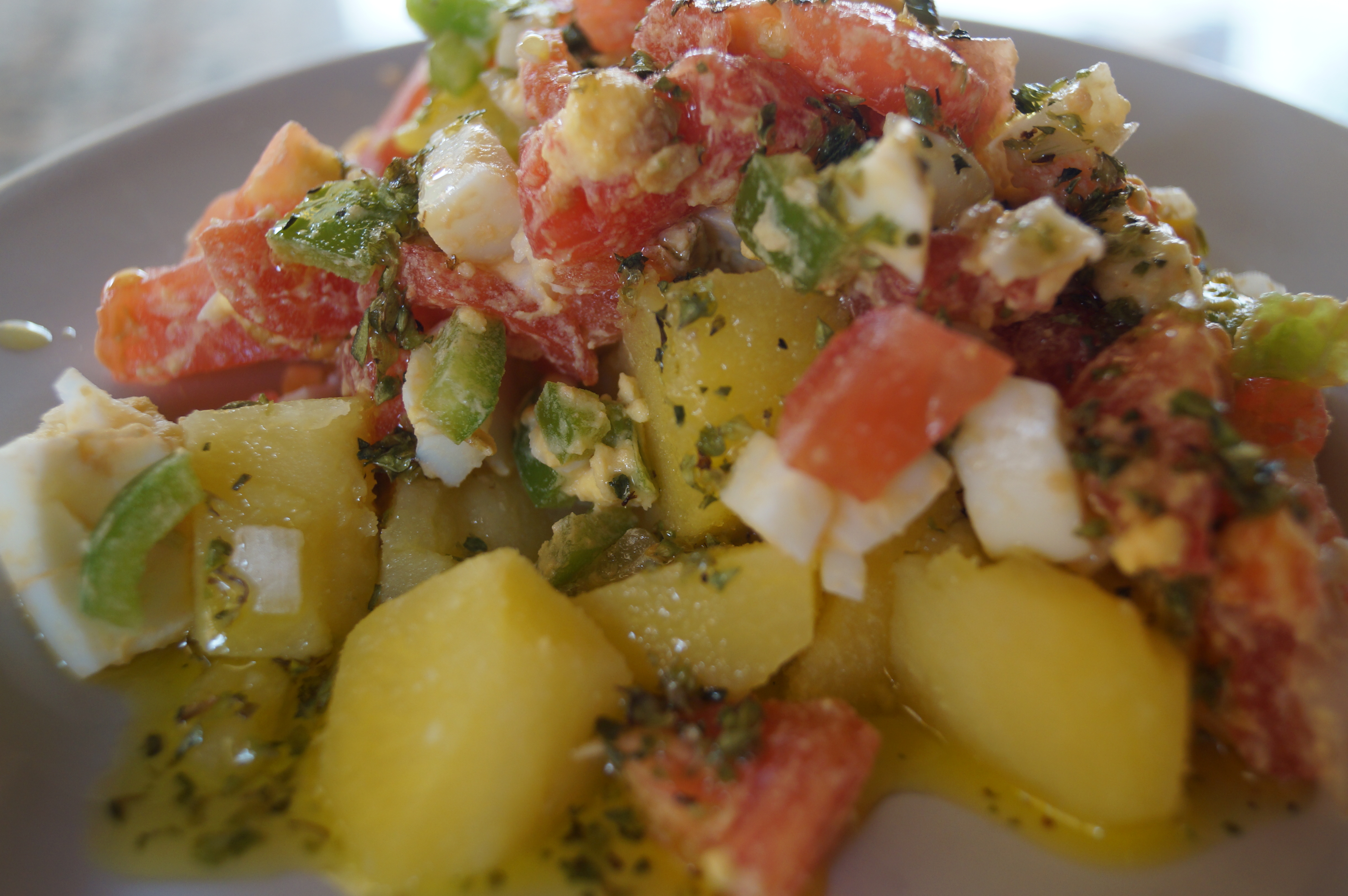 Ponemos las patatas y los ingredientes en una fuente grande y mezclamos con cuidado de que las patatas no se deshagan demasiado. En un vaso echaremos una buena cantidad de aceite, la misma cantidad de vinagre o quizá un poco menos si os parece demasiado fuerte, la sal y el orégano. Removemos bien con ayuda de un tenedor y