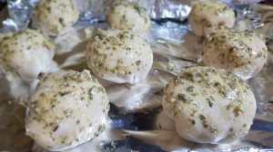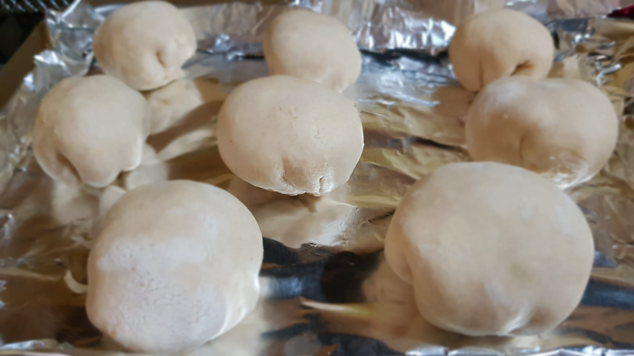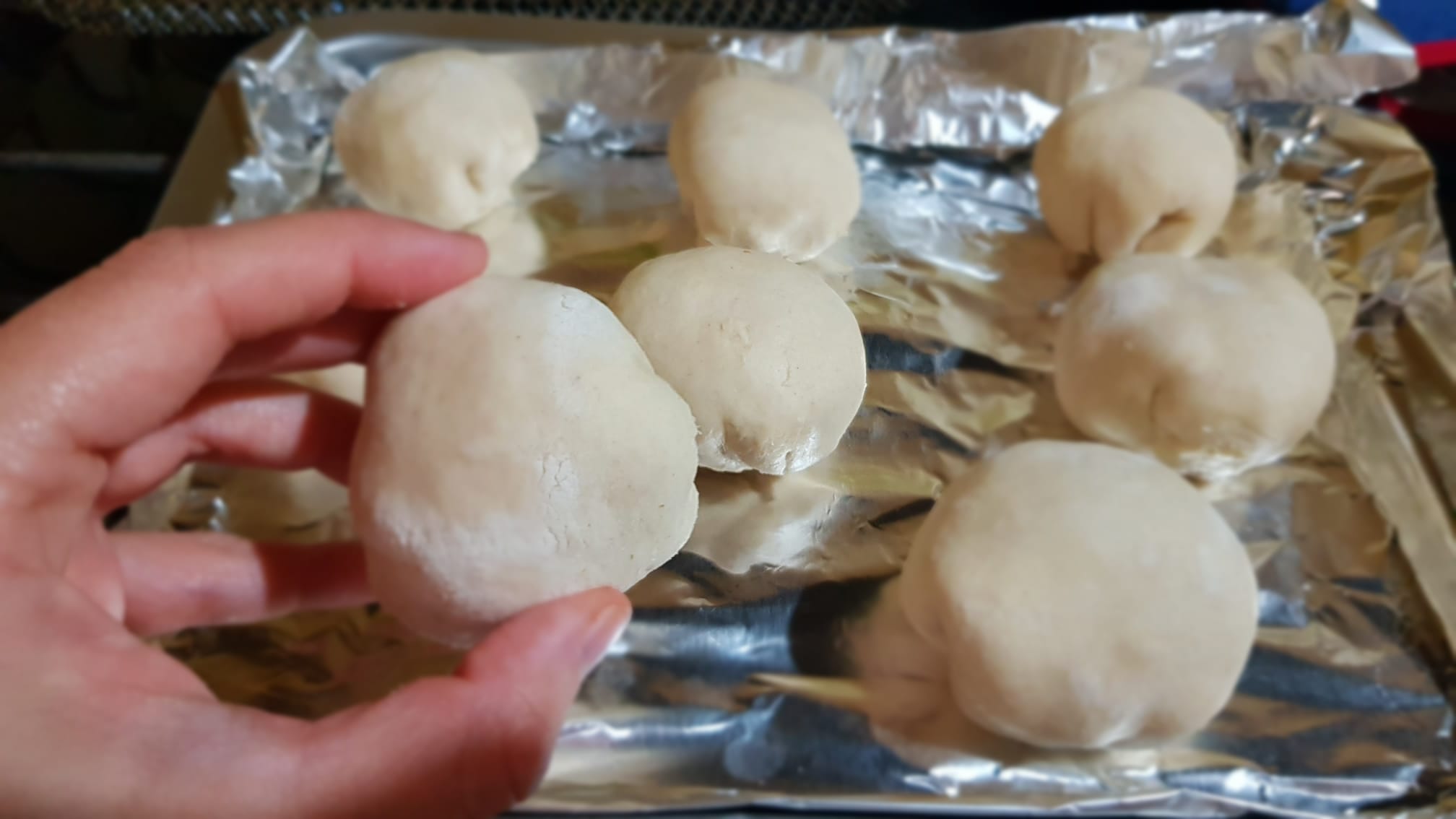 En una bandeja de horno con papel de horno colocamos nuestras bolitas y las pintamos con una mezcla de huevo, ajo picado, parmesano y un poco de orégano.